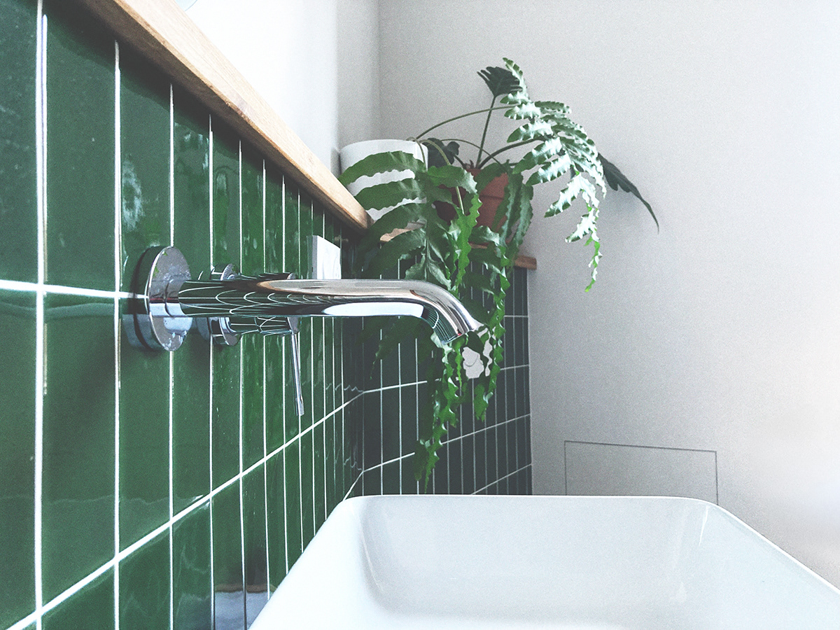 Aménagement d'une salle de bain avec des matériaux de réemploi.